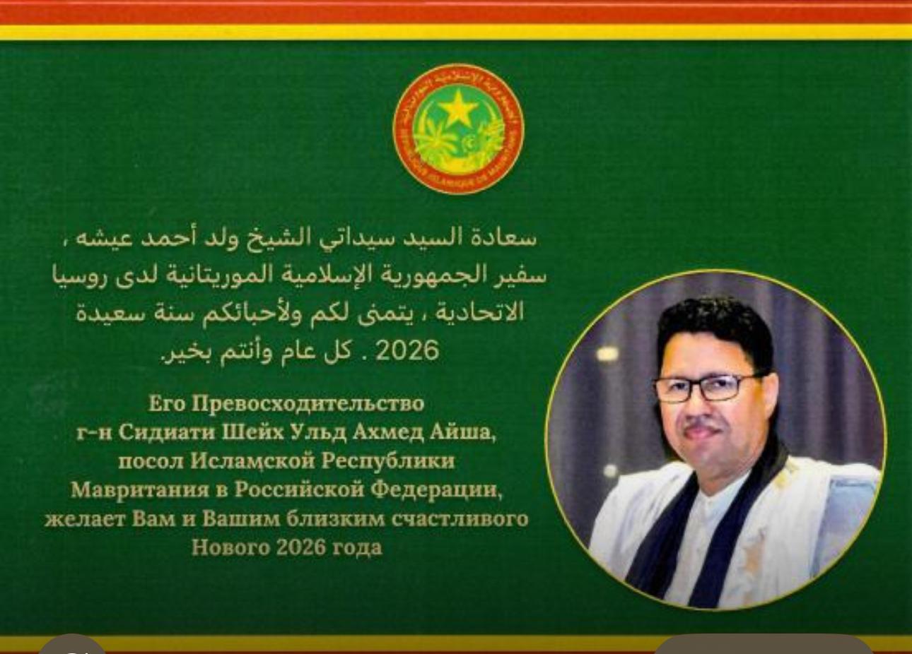 رسالة تهنئة بمناسبة السنة الجديدة سعادة السفير السيد سيداتي الشيخ ولد أحمد عيشه، سفير الجمهورية الإسلامية الموريتانية لدى روسيا الاتحادية،يتمنى سنة سعيدة لفخامة الرئيس وللحكومة وللشعب في موريتانيا وللجميع..